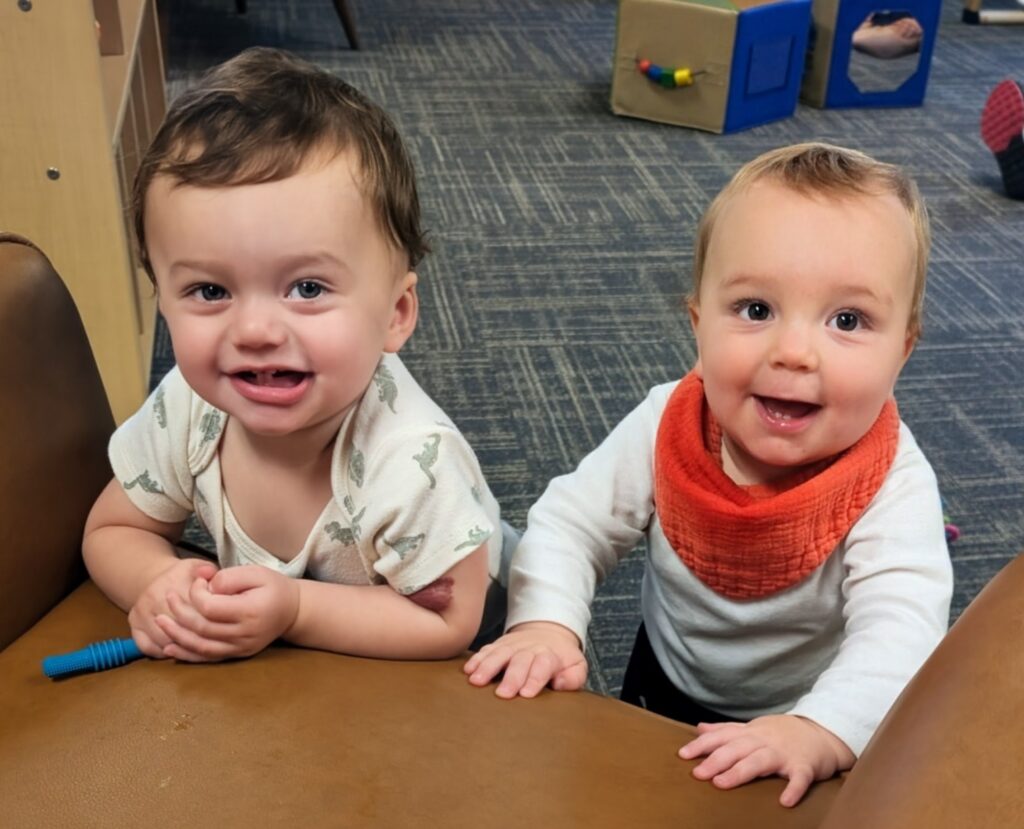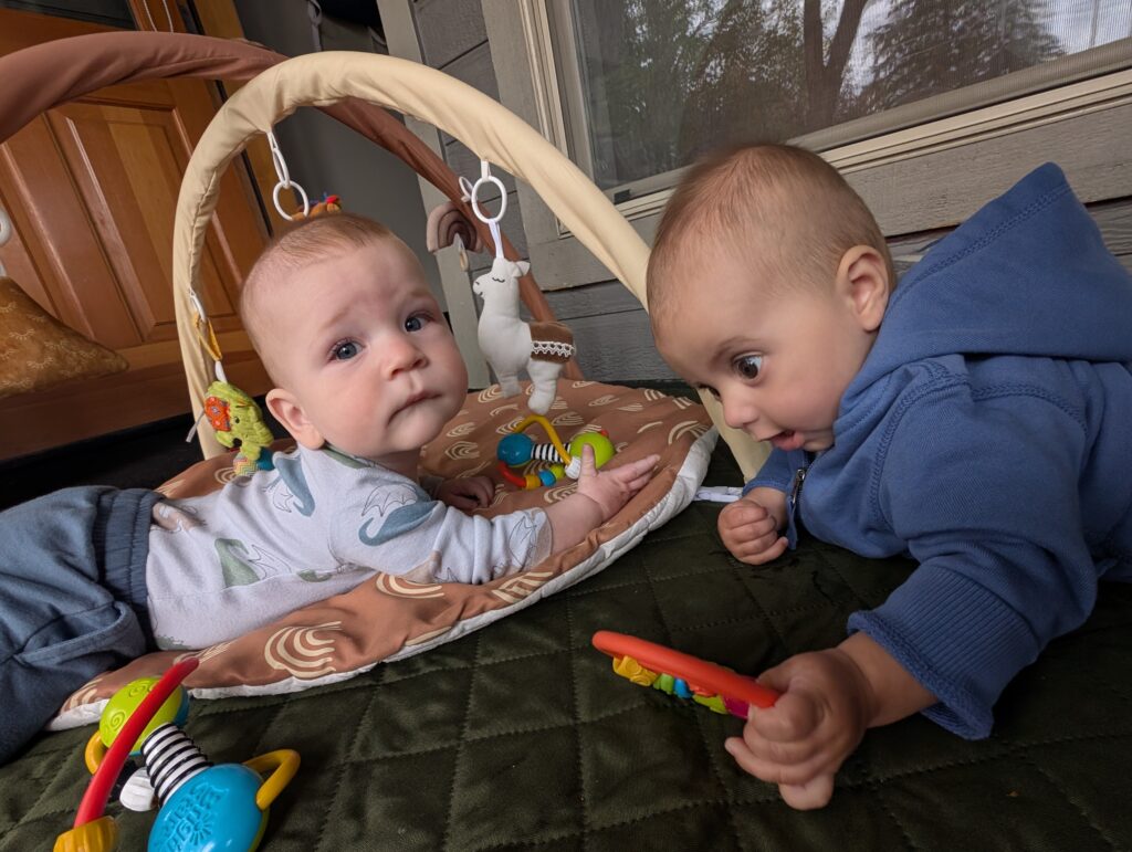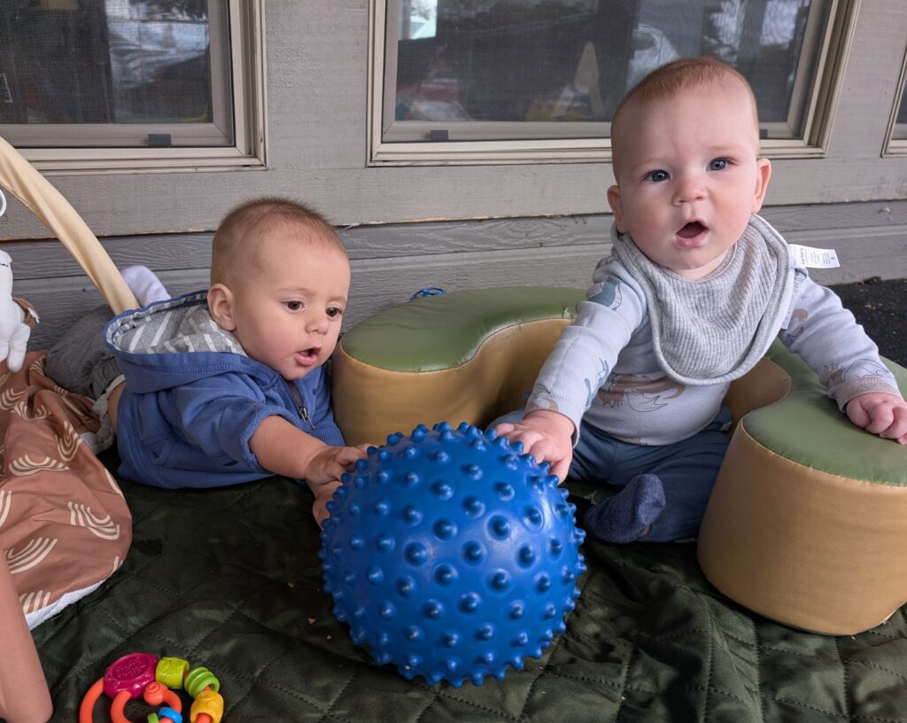 Sonny and Archie will roll off their play mats until they end up next to each other, then smile and touch hands while cooing to one another. They are both busy little guys who want to be active and are beginning to sit with support.