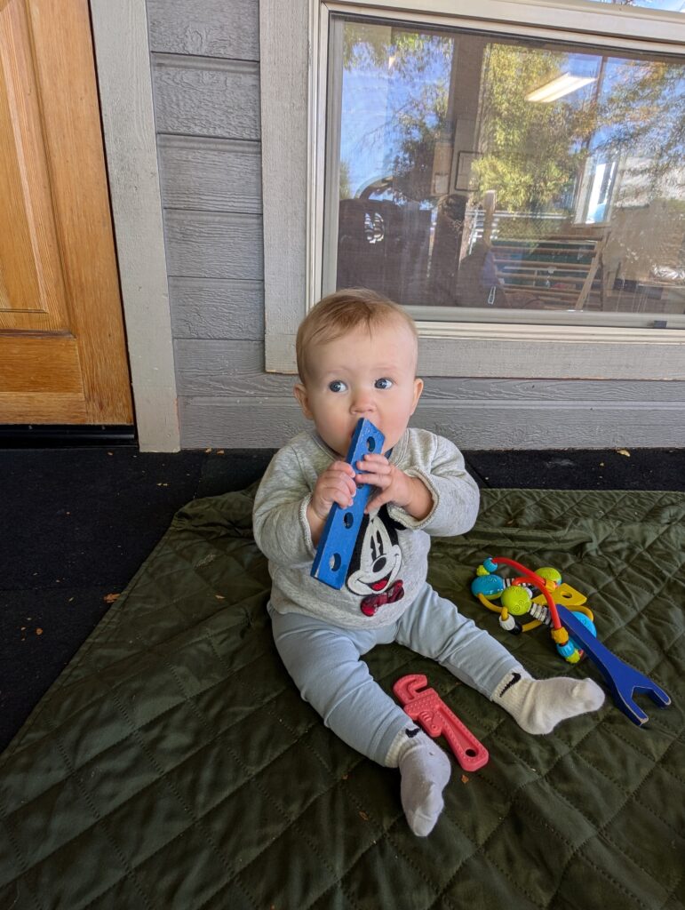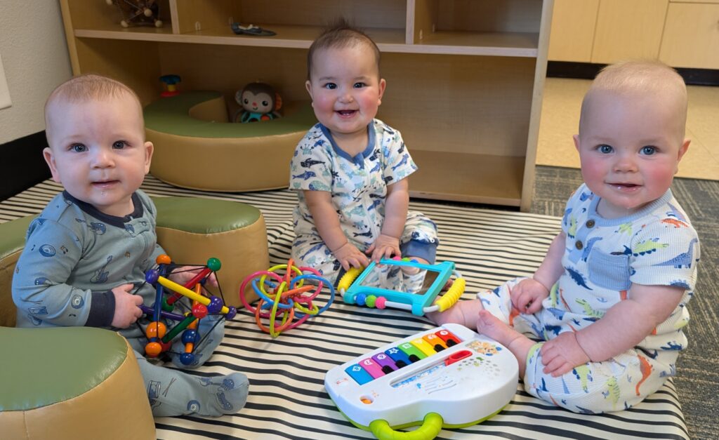 Ren, Ellie, and Hudson are confident sitters, and Ren and Hudson have even started sitting at the table for some of their meals. Ren is leaning forward onto her hands and one knee, trying to get into a crawling position. While she hasn’t figured out crawling yet, she has been scooting herself short distances around the classroom. Hudson and Ellie prefer to start from their stomachs and try to push forward with their toes; when they get tired of that, they roll to get where they want to go.