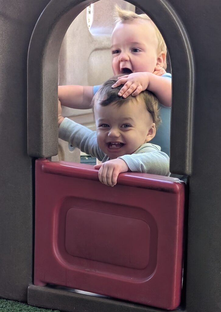 Jack and Theo met up like they were old friends, playing peek-a-boo around the chairs in the classroom and through the windows of the outside playhouse. They laugh until they are out of breath and are always looking for each other when they aren’t together. We are so happy that they will be moving to the Big Seed room together in November, but we will miss watching them play.