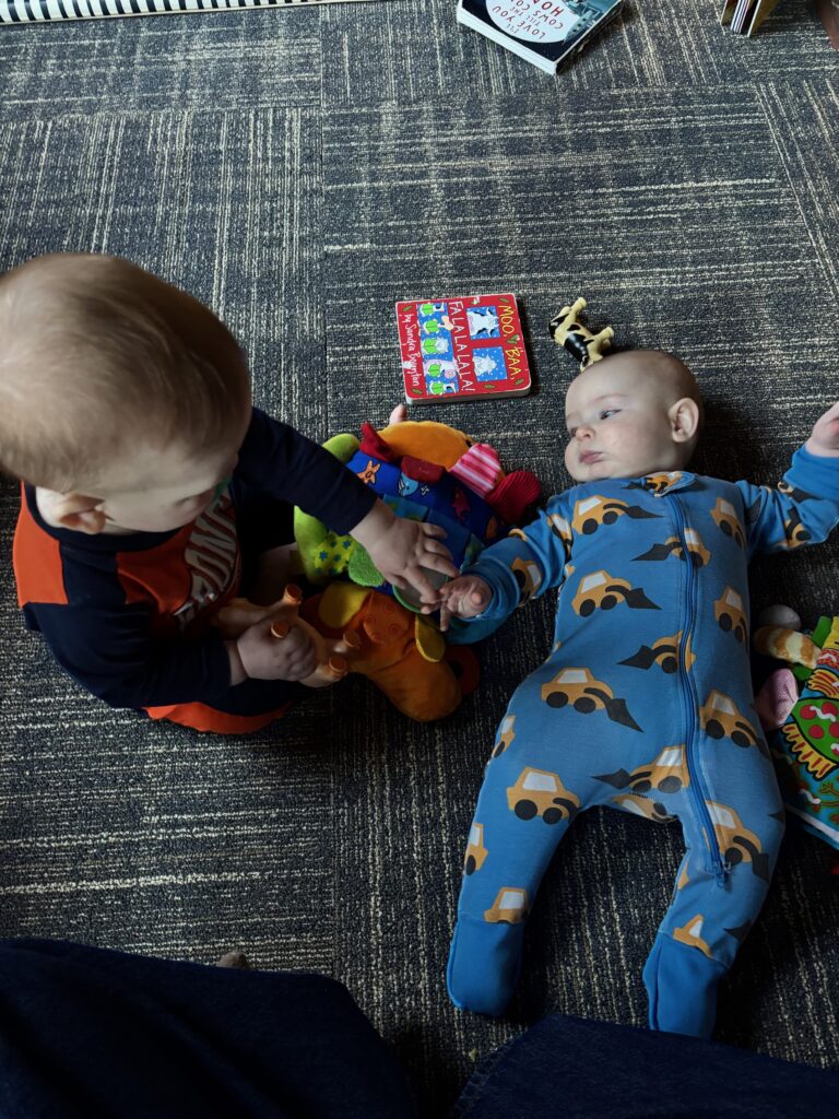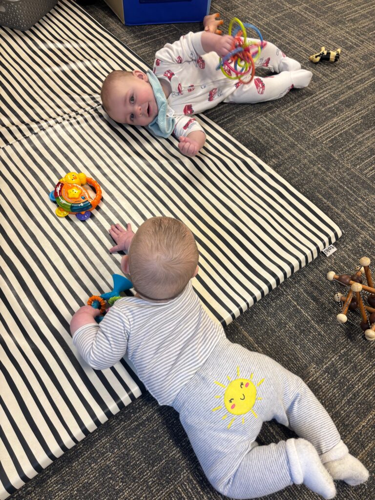 Our babies are at various stages right now. Ellie, Sonny, Archie, and Graham are all cruising around the classroom, so we set up toys in different areas or slightly out of reach to encourage reaching or pulling up to reach them. Bodhi, Calvin, Elliotte, and Luke are working on tummy time, rolling, and grasping for toys. We provide plenty of opportunities to develop these skills, such as supporting them while lying on their side, helping them sit up, and placing toys within reach.
