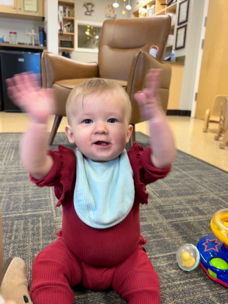 clapping to songs and when friends/teachers come into the classroom! Ellie is also working on throwing the balls we have in class!