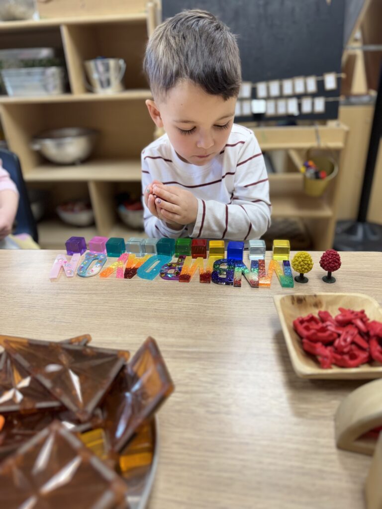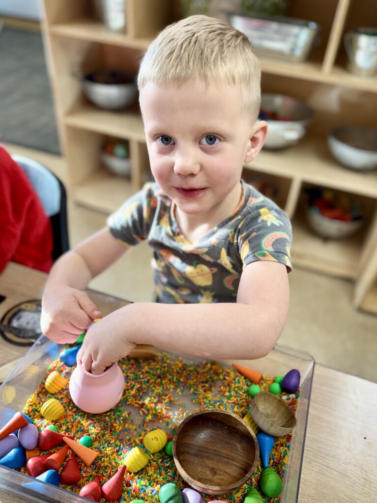 Next, as a whole group, we discussed how rainbows are formed. Our Branchers discovered that a rainbow appears when sunlight shines through raindrops. It’s a simple explanation, but it creates a spectacular result! The Branchers were so excited to learn how rainbows form. They even tried making their own in the classroom using sunlight from the window and a prism. They learned that sunlight contains all the colors, and prisms or raindrops help separate those colors so we can see them. As we headed outside that morning, many friends ran out to search the sky for a beautiful rainbow.