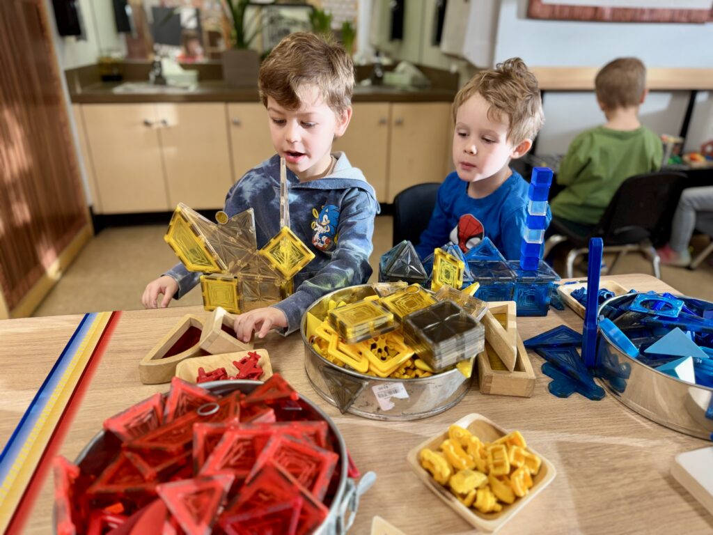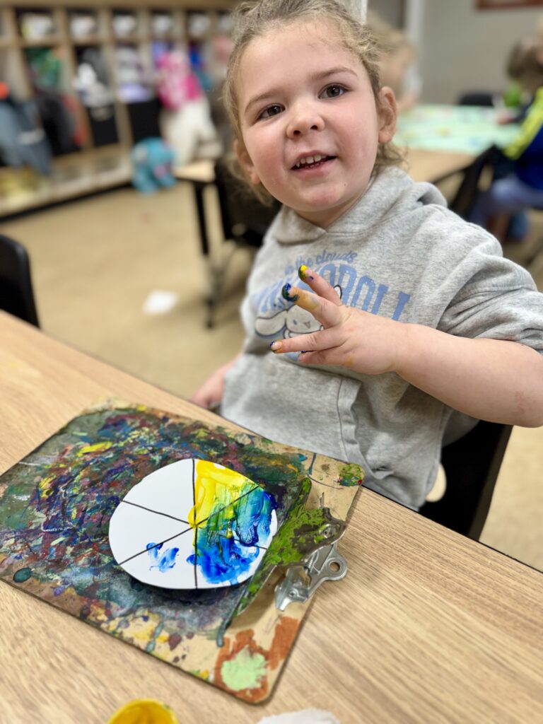Primary colors were next on our discovery list! At circle time we introduced the book Mix It Up! by Hervé Tullet. In the story we learned about the three primary colors: red, yellow, and blue. The book interactively showed how mixing colors together creates secondary colors: orange, green, and purple. We also discovered that adding white makes colors more pastel, while adding black makes them darker.