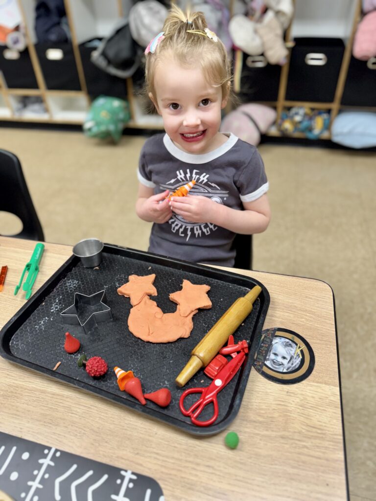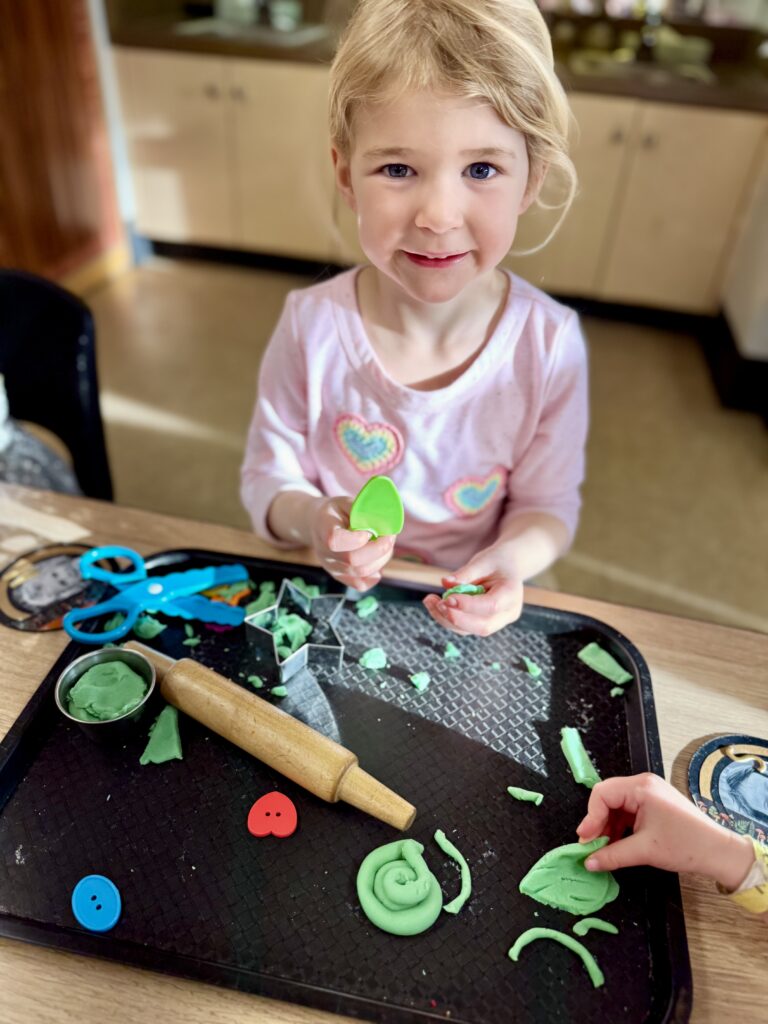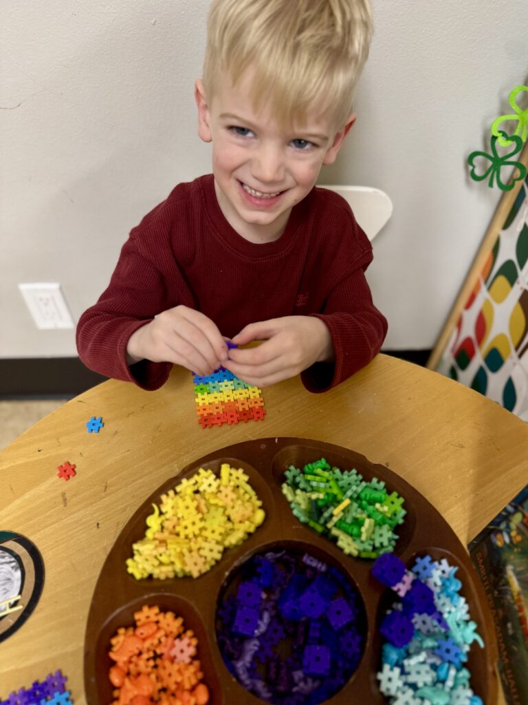 Branchers then worked together to make Play-Doh. We couldn’t decide what color to make… and that’s when our leprechaun helped us! When we returned to school the next day, the Play-Doh that had been one big ball of white was shaped into many small balls, but it was still white. We passed out a ball to each Brancher and waited for the leprechaun’s magic to happen! As the Branchers squeezed and played with the dough, it began to change colors. (Hidden inside each white ball was a small amount of colored dough that appeared as they mixed.) Soon, we discovered we had the primary colors: red, yellow, and blue. Mixing Play-Doh is always tempting, and finally, they had permission to try it! So, the Branchers split their dough in half and swapped with a friend who had a different color. As they mixed, they created new secondary colors until we had the entire rainbow! Thank you, Paddy O’Giggles, for such a fun way to make a rainbow!
