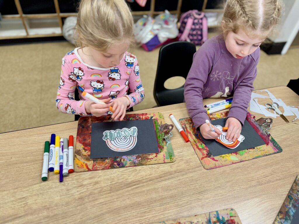 Next, it was time to create our rainbow art. Using markers, the Branchers drew their own rainbows! After completing their artwork, they practiced writing the names of the rainbow colors as they are spelled. It was impressive to hear them identify each letter as they carefully wrote them down.