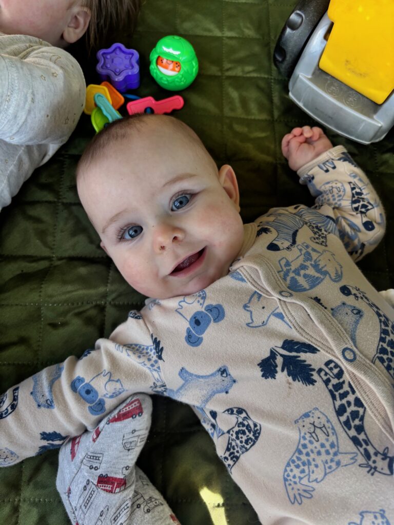 Bodhi has mastered his skills in rolling back and forth! He rolls to his tummy to grab a toy, then rolls to his back to continue his play!