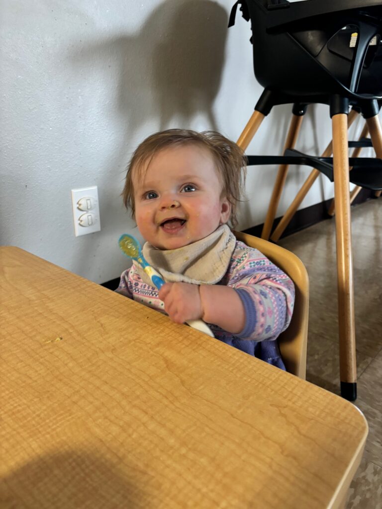 Elliotte has introduced purees to her day-to-day, and she loves it! She has also been working on her independent sitting– engaging her core muscles!
