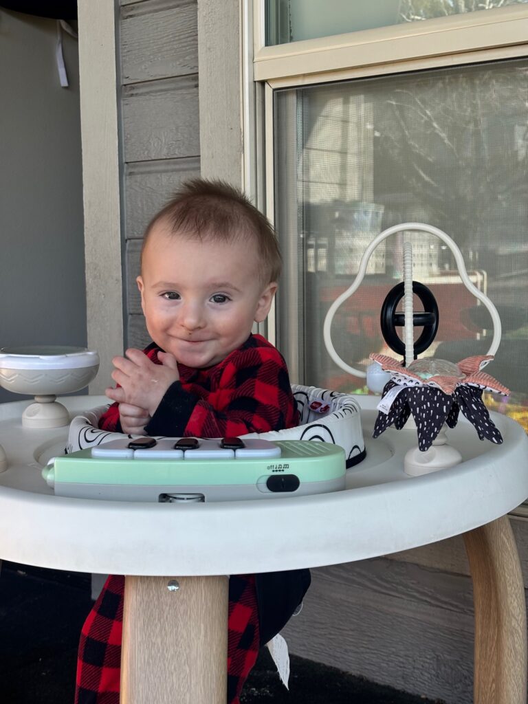 Sonny began walking with no assistance. He giggles the whole time and claps after he sits back down. Sonny has begun using the sign for eat and saying “tuh-tuh” when he wants to eat!